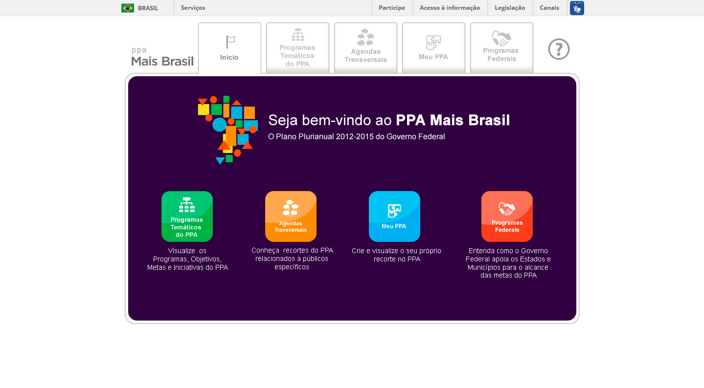 https://bibliotecadigital.gestao.gov.br/handle/777/586| Title: | Aplicativo Mais Brasil para acompanhamento do PPA 2012-2015 |